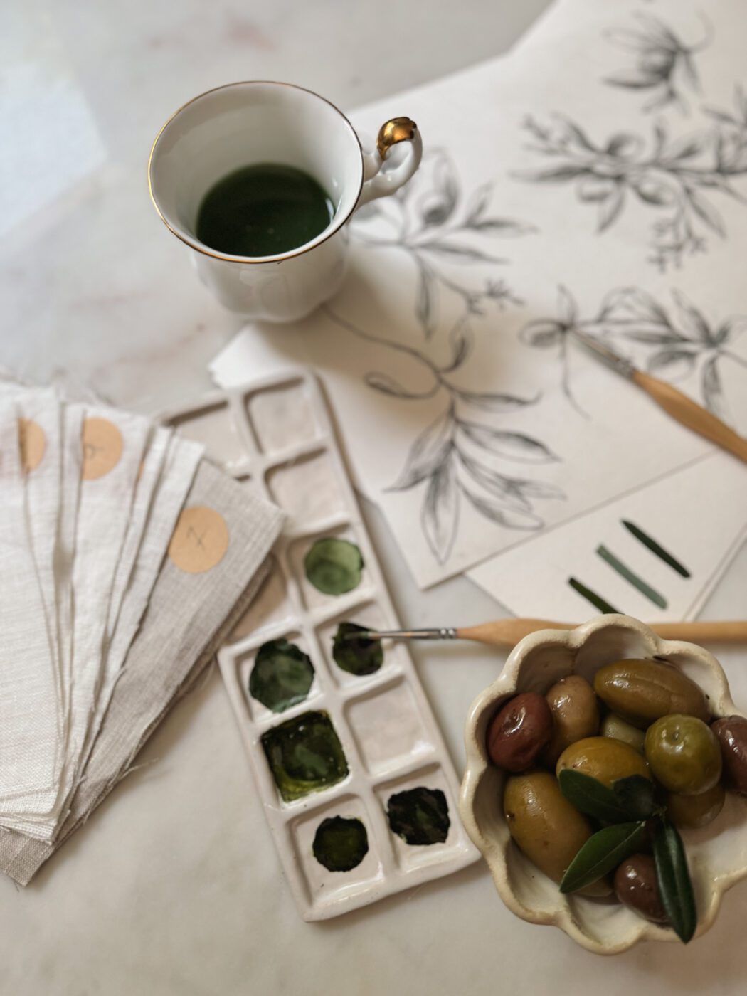 Each piece in the collection is adorned with hand-drawn olive branches, a powerful symbol of peace, abundance, and our deep Italian roots. These delicate illustrations, sketched by Nadia herself, feel like a quiet homage to our families story and what we value – hospitality, warmth, and beauty in the everyday.